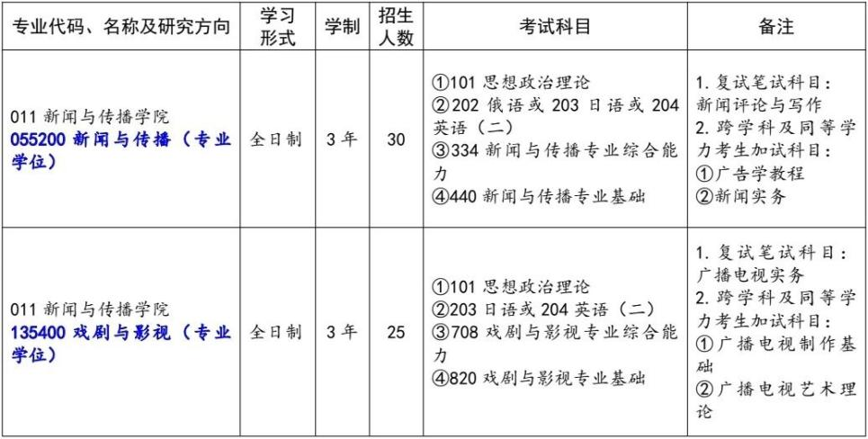 拟招收硕士研究生55人,其中新闻与传播专业硕士30人,戏剧与影视专业硕士25人,(学校按照正式下达的招生计划开展录取工作,根据各专业生源情况、初试成绩等因素进行适当调整)。实际招收推免生人数以“全国推荐免试攻读研究生信息公开暨管理服务系统”确认录取人数为准。