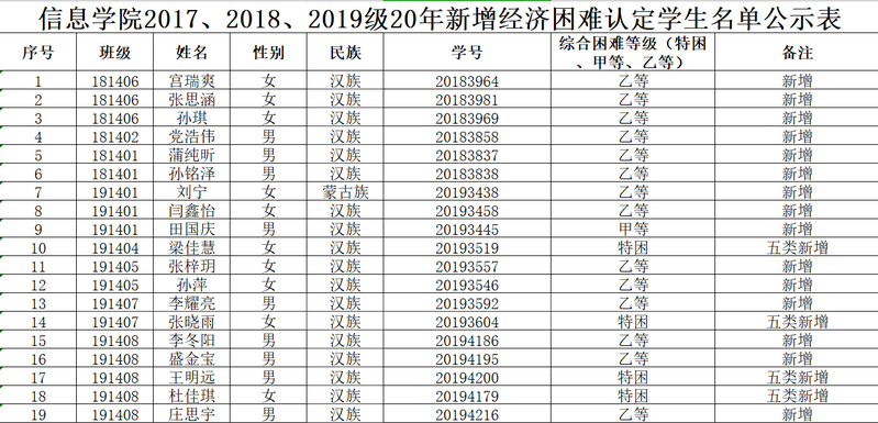 信息传播工程学院2017、2018、2019级20年新增经济困难认定学生名单公示