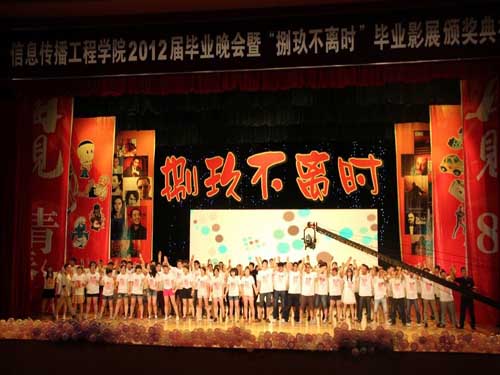 信息传播工程学院讯(通讯员 韩美华)又是一年毕业季,又是一年离别时。2012年6月20日晚6:30,信息传播工程学院在我校南湖校区大学生活动中心隆重举办2012届毕业晚会暨“捌玖不离时”毕业影展颁奖典礼。参加本次典礼的学校各部门领导有仙女宫