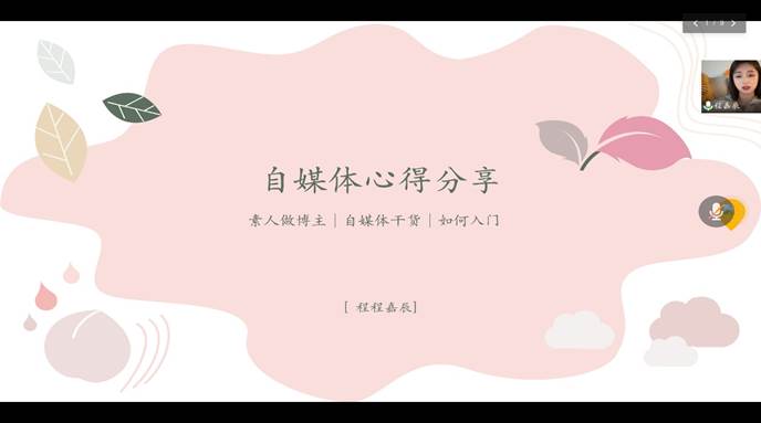 网络与新媒体系举办了《自媒体运用——从0到百万博主心路历程》经验分享会。会议邀请自媒体博主程嘉辰通过腾讯会议向全院师生展开新媒体相关的讲座交流活动。