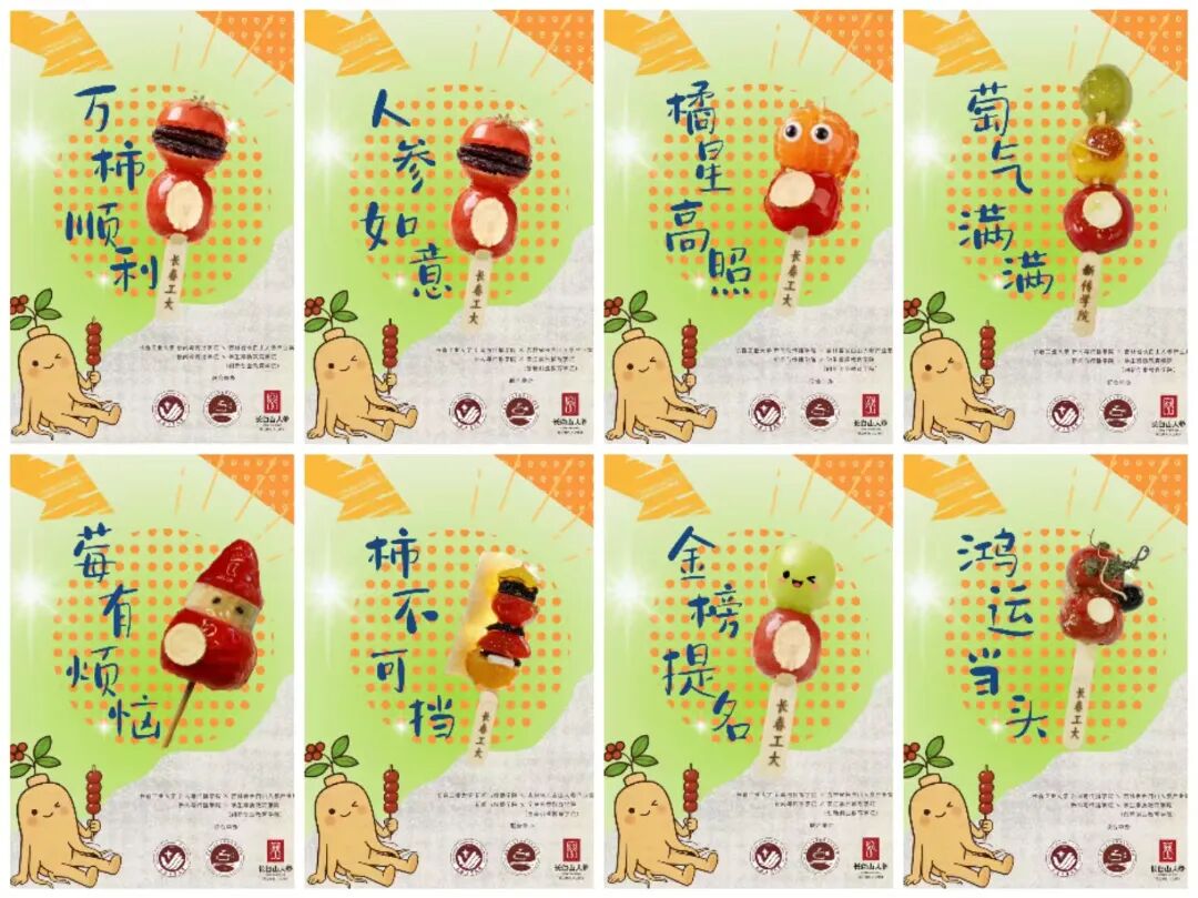 的师生们化身“文创匠人”,从食材甄选到造型设计全程亲力亲为。精选颗粒饱满的本地山楂,搭配营养价值丰富的长白山人参,经过去核、串制、熬糖、裹衣等多道工序,别出心裁的与人参蜜片、人参冻干片、人参花、人参粉、人参须等进行创意结合,制作出造型别致、酸甜可口的人参糖葫芦(人参如意)。除经典原味外,现场还推出了晴王葡萄(金榜题名)、丹东草莓(莓有烦恼)、圣女果(万柿如意)、砂糖橘(橘星高照)、奶皮子等创新口味,这些口味不仅满足了不同师生的味蕾需求,更饱含着学院对广大师生特别是即将踏上征途的考研同学们的真挚祝福。更有师生发挥专业特长,在糖葫芦包装上融入仙女宫