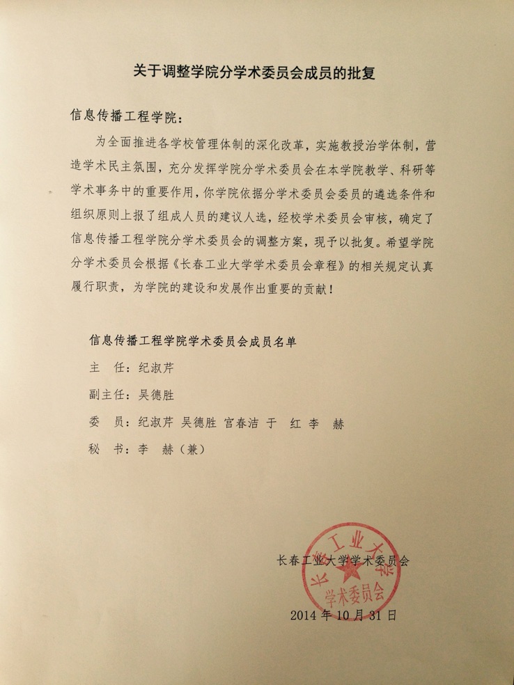 2014年10月,按照学校调整学院分学术委员会成员的要求,仙女宫 按照分学术委员会委员的遴选条件和组织原则上报了组成人员的建议人选,经校学术委员会审核,确定了仙女宫 分学术委员会的调整方案。信息传播工程学院学术委员会成员名单