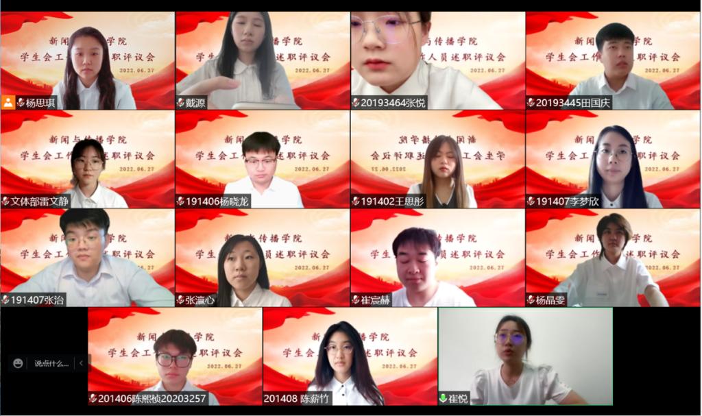 最后,学生团委工作负责人崔悦了总结会议内容。崔悦指出此次述职报告评议会大家准备充分,述职报告圆满结束,各部负责人在今后的工作中也将继续努力、不断进步,认清自身的身份定位,更好地为大家服务,为学院学校高质量发展贡献自己的力量!